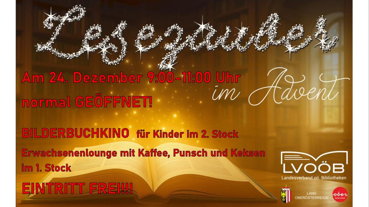 Dezember, 2025 Bilderbuchkino zu Weihnachten am 24. Dezember 09:00 - 11:00 Uhr Um die Wartezeit zu verkürzen, gibt es bei uns am 24. Dezember ein Bilderbuchkino und eine Erwachsenenlounge. Eintritt frei!